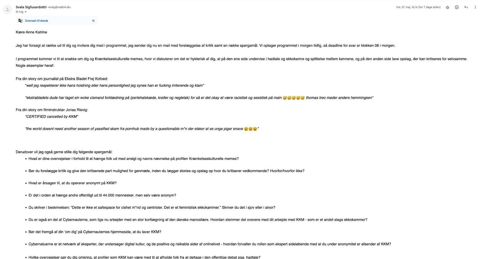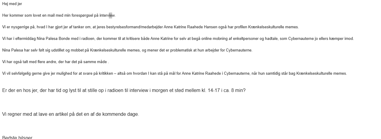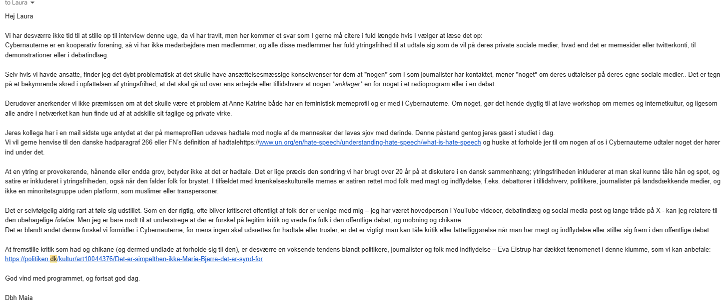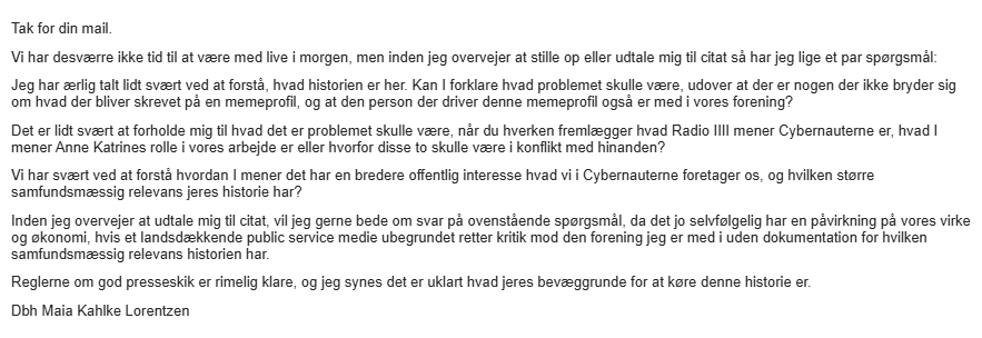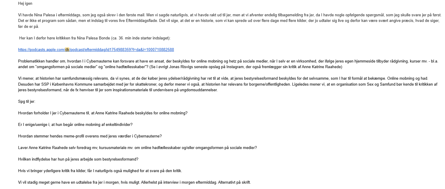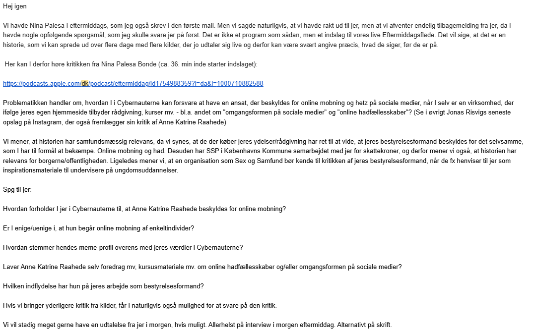 Svar på ovenstående mail fra journalisten, sendt 2 juni 22.25.Link til program hvor Cybernauterne kritiseres, 2. juni:https://podcasts.apple.com/dk/podcast/eftermiddag/id1754988359?l=da&i=1000710882588