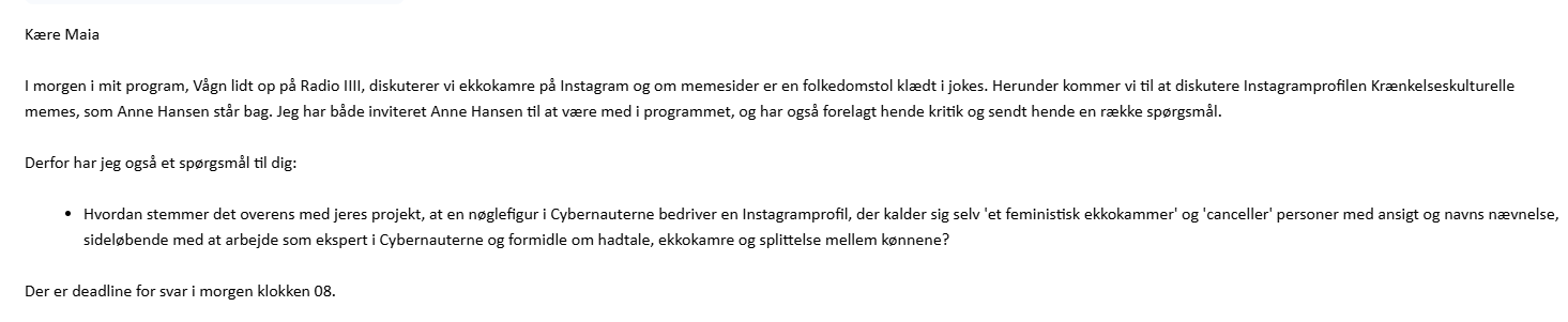Spørgsmål til Cybernaut Maia Kahlke Lorentzen fra vært på programmet "Vågn lidt op" modtaget 27. maj kl 16.35.Link til programmet "Vågn lidt op" med kritik af Cybernauterne og krænkelseskulturelle memes, sendt 29. maj https://radio4.dk/podcasts/vaagn-lidt-op/er-kr-nkelseskulturellememes-hyklerisk