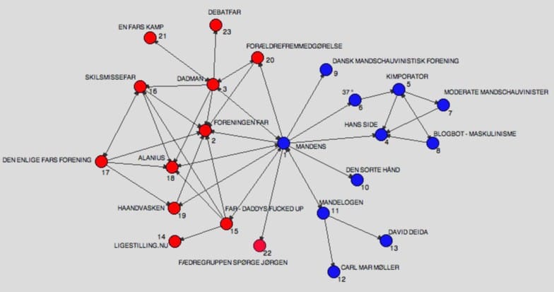↑ Illustration af den danske manosfære anno 2007, fra specialet 'Frihed, Lighed og Faderskab'. Prikkerne udgør forskellige hjemmesider og fora. De røde prikker omhandler faderskab, de blå prikker omhandler maskulinitet mere generelt.I de mellemliggende 18 år har fremvæksten af sociale medier og deres netværkseffekt betydet, at den danske manosfære har en langt større tilstedeværelse både online og offline. Manosfæren i Danmark har fået flere aktører og digitale fora samt flere formelle organiseringer, der sætter politiske og kulturelle dagsordener.
