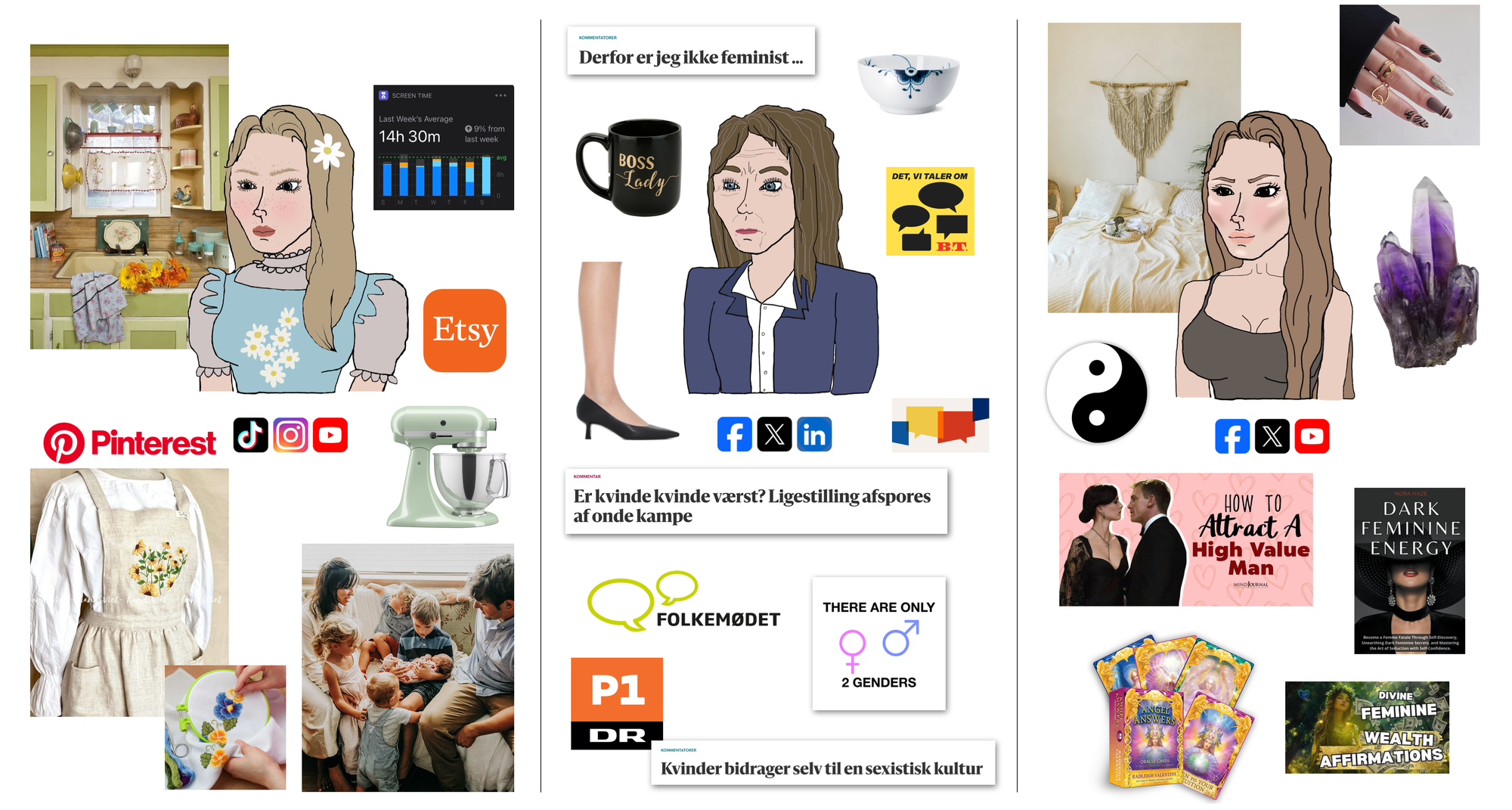 Fælles for kvinderne i manosfæren er en fortælling om, at feminisme er en skadelig ideologi, som i virkeligheden undertrykker kønnene, eller at kvinder er lykkeligere og mere i balance i traditionelle kønsroller. Den britiske avis The Guardian havde en artikel om tendensen i april 2025, hvor de betegnede kvinderne som the womanosphere. Vi kan dele kvinderne i den danske manosfære op i tre hovedkategorier: Tradwifen, anti-feministen og femmefluenceren.