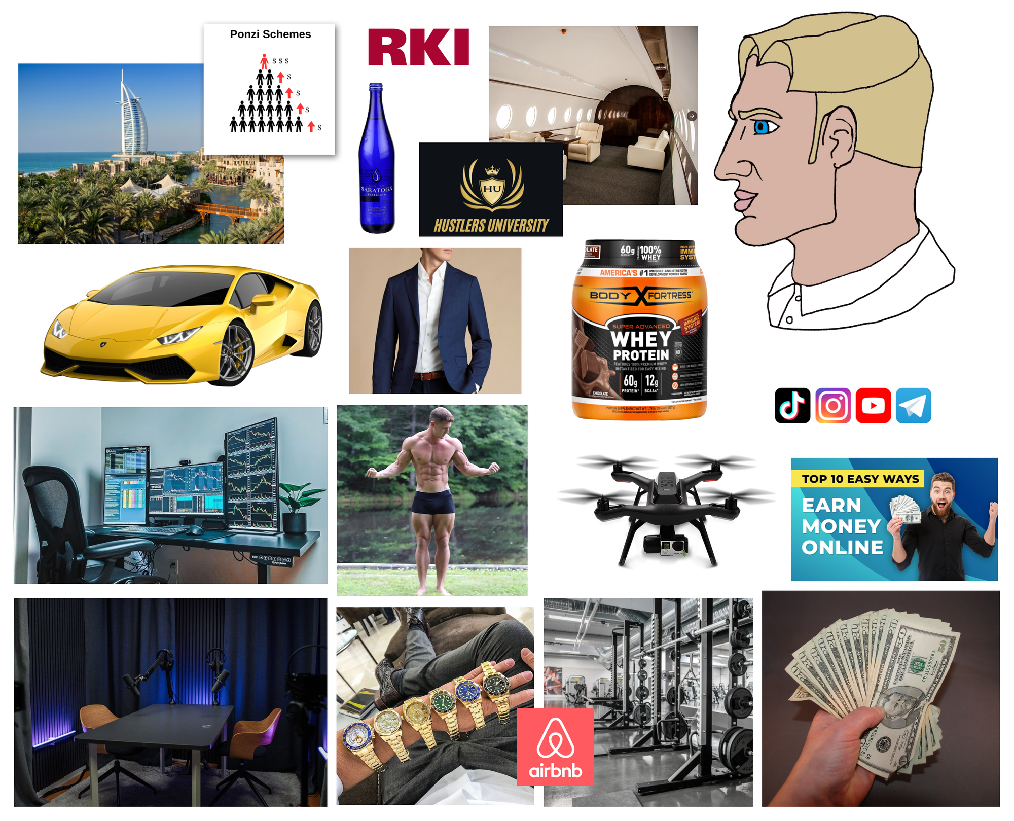 Mange manfluencers er tydeligt inspirerede af den trafficking-anklagede britiske influencer Andrew Tate og hans onlinekurser på det såkaldte Hustler’s University, der i praksis er mere et pyramidespil, hvor man tjener penge på at hverve, snarere end gennem de kompetencer, kurserne reklamerer for. I kategorien er også populære indholdsskabere fra f.eks. gaming-verdenen, der tjener penge på merchandise, sponsoraftaler og donationer.