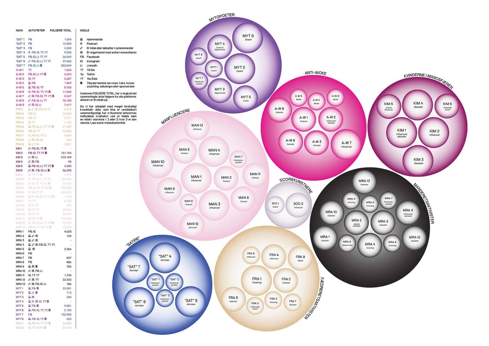 Vores visualisering af den danske manosfære anno 2025. Vi har identificeret 67 forskellige aktører og inddelt dem i tematiske grupper der beskrives i det følgende. Hvilke platforme de er på og deres samlede antal følgere er indikeret i venstre spalte.Manderetsaktivister
