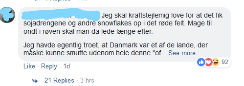Kommentar på kæden Normals post fra 9. juni 2018, som afbildet ovenforDet er interessant at se at ordet kædet sammen med et andet amerikansk låneord - snowflake - som betyder sart eller krænkelsesparat.