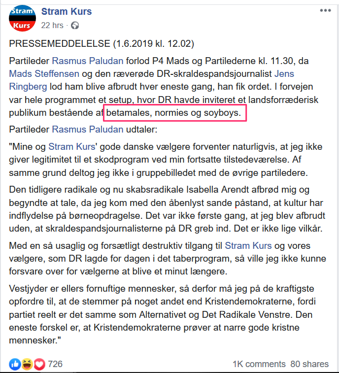 Opslag på Stram Kurs hjemmeside 1.juni 2019Paludan kalder rutinemæssigt kritiske journalister for røde lejesvende og folk der er uenige med ham for landsforrædere. Men den kønnede fornærmelse af DR’s publikum som ‘Betamales, normies og soyboys’ har man måske ikke hørt om før, medmindre man roder meget rundt på internetfora som 4chan og reddit.
