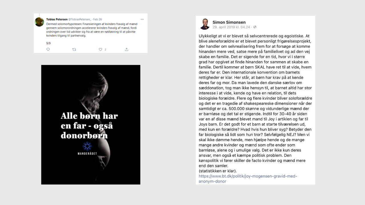 Øverst fra venstre: Tobias Petersens "solomorhypotese", kampagnebillede fra Manderådets Facebookside, Simon Simonsens Facebookopslag om Joy Mogensen Som vi også ser det med Simon Simonsen tydeliggør han ikke hvor tallene stammer fra, eller hvordan han ved, at alle mænd i Danmark, der ikke har børn, ikke selv har valgt det. Tallet ser dog stort og overvældende ud.