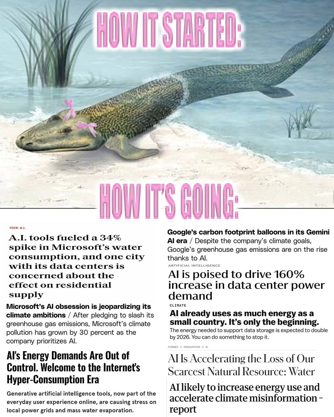 “Kunstig intelligens” bruger også utroligt meget vand, blandt andet for at nedkøle de datacentre, der driver processerne. Ifølge et studie fra OECD vil “kunstig intelligens”-teknologier i 2027 bruge 4-6 gange så meget vand som Danmark bruger årligt. Et nyt studie fra University of California estimerer ChatGPT bruger to liter vand på 10-50 prompts.